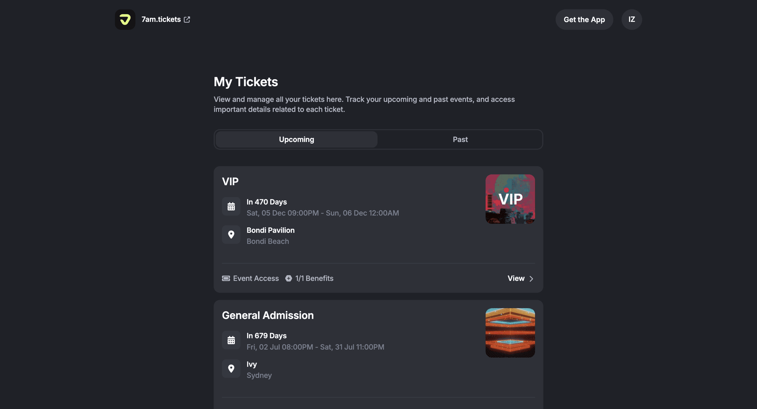 After clicking the My Tickets tile, you’ll be taken to the My Tickets page, where you can view and manage all your tickets. Here you’ll find two tabs, ‘Upcoming’ and ‘Past’, to track your future events, past events, and access details for each ticket.